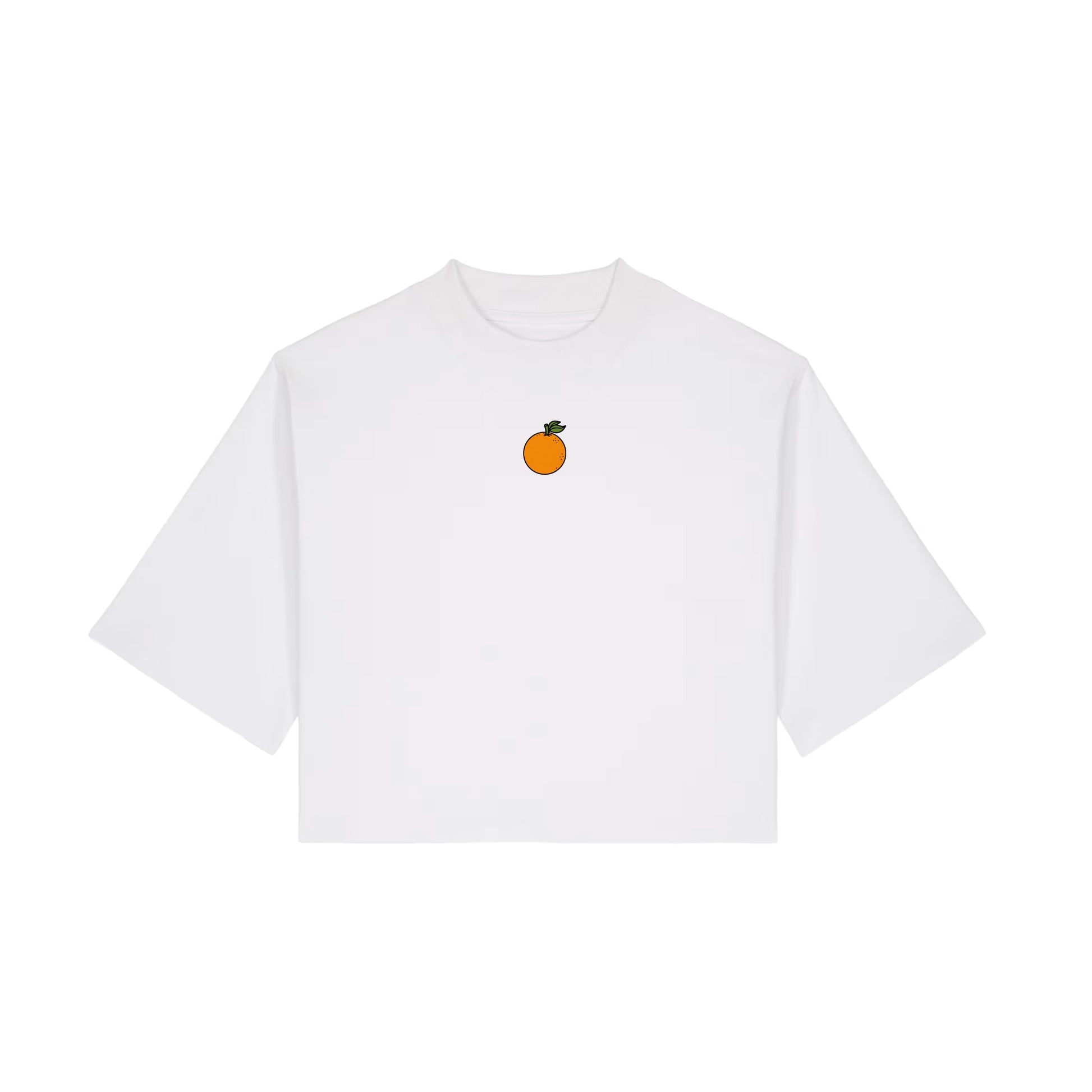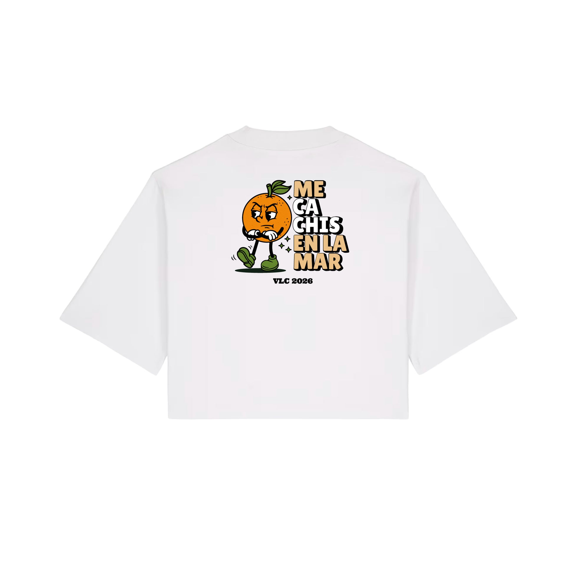 - Ilustración con Carácter: Diseño original en la espalda con nuestra naranja de brazos cruzados y ese toque retro-cartoon que nos flipa.
